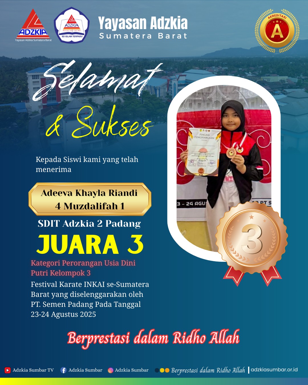 Read MoreAlhamdulill?h, Barakall?hu fiikum kepada siswi sholeha berprestasi kami Adeeva Khayla Riandi (4 Muzdalifah 1) dari SDIT Adzkia 2 Padang yang telah meraih: Juara 3 Kategori Perorangan Usia Dini Putri Kelompok 3 pada Festival Karate INKAI se-Sumatera Barat.