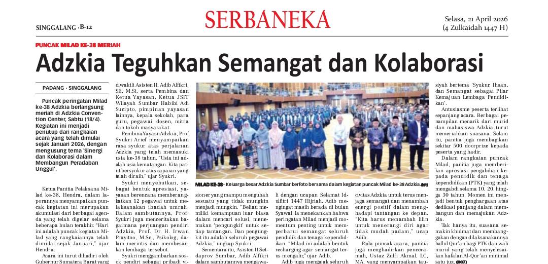 Yayasan Adzkia Sumatera Barat merupakan lembaga pendidikan islam yang berkantor pusat di Jalan Taratak Paneh No. 7, Kuranji-Padang. Adzkia berdiri pada tahun 1988. Berdirinya Adzkia berawal dari bimbingan belajar Adzkia tahun 1987 yang berpusat di Lolong Padang dan didirikan oleh Prof. Dr. Irwan Prayitno, Dr. Syukri Arief, M. Eng, Mahyeldi Ansharullah, SP dan kawan-kawan.